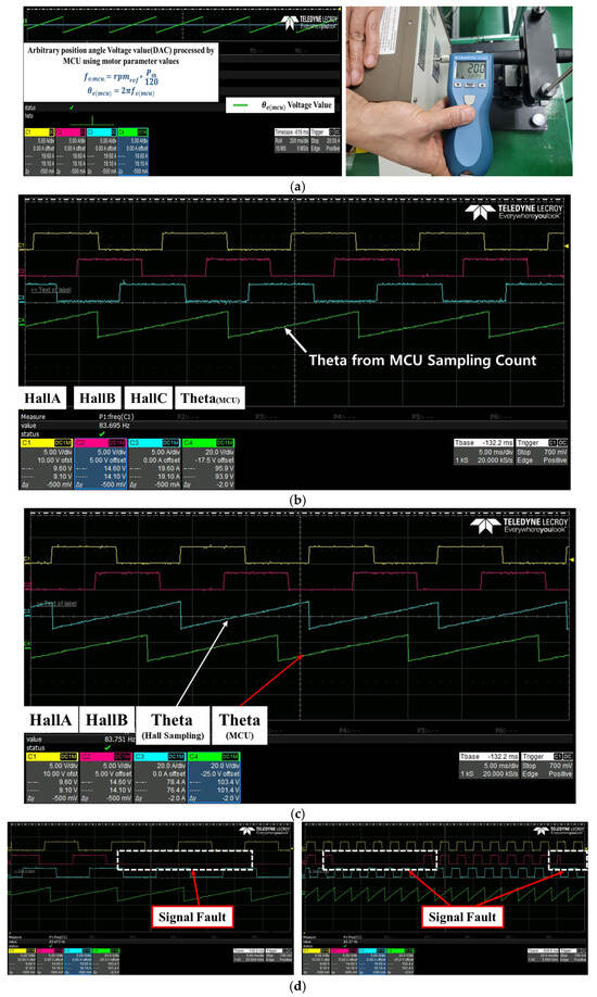 (a) Output waveform conversion of and speed measurement in extreme low-speed mode (200 rpm). (b) Waveforms of processed position signals through MCU computations and Hall sensor signals. (c) Waveforms of position signals processed through the Hall sensor and position signals processed through MCU computations. (d) Verification of stable position signals output even when the Hall sensor stops functioning.