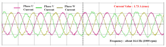 Based on a stable signal from the Hall sensor at 1000 rpm, the position error was eliminated using a PI controller, and the processed rotor position was applied to the control algorithm. Figure 18 shows the current waveform results for constant-speed operation at 1000 rpm using the position signal processed through the Hall sensors, applying the rotor position transition algorithm from Figure 8. The proposed rotor position transition algorithm was experimentally verified.