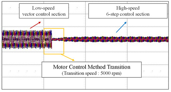 The speed requirements for machining hard prosthetic materials are typically met in the range below 5000 rpm. Therefore, to address the demands of high-speed operation, the proposed control method transition algorithm was implemented with a threshold set at 5000 rpm. Figure 19 represents the current waveforms obtained during the transition to six-step control from low-speed vector control to high-speed operation as the speed increases, based on the rotor position transition algorithm presented in Figure 8. As the speed increases during six-step control, it can be confirmed that the current ripple does not occur significantly in the variable speed range, verifying that the position error is well compensated.