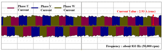 Finally, Figure 22 shows the three-phase current waveforms when a fault was injected into the Hall signal during operation at 50,000 rpm, as depicted in Figure 21. At the most extreme range, with a maximum speed of 50,000 rpm, the mechanical and electrical frequencies of the target two-pole motor are both 833.33 Hz. Despite the high-speed frequency, control was achieved without issues under the condition of a 10 kHz switching frequency, using two-phase commutation and the six-step control algorithm. From the experimental results, it was verified that the position data correction algorithm, which can determine the failure of the Hall sensor in real time, as explained in Figure 15, and maintain stable operation even in the event of a sensor failure based on the normal Hall sensor signal, is appropriately controlled.