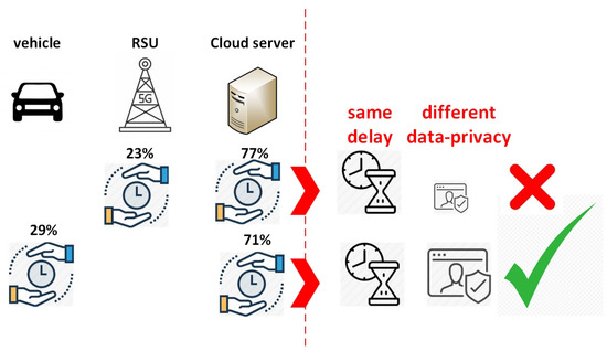 As we mentioned in the problem definition, end-to-end delay, which includes model training and processing times in servers, and data privacy of end-users are vital in vehicular networks [29]. In other words, from the end-user perspective, they should both be satisfied. However, to the best of our knowledge, there is no study that considers the trade-off between delay and data privacy on complex and dynamic scenarios in the literature. Therefore, we execute preliminary analysis for delay and data privacy while computing tasks in between vehicles, road side units (RSUs), and cloud servers, as shown in Figure 1. During the analysis, the same delays have been observed at different locations of task computing. For example, case (a), which runs 23% of tasks on RSU servers and 77% of tasks on the centralized cloud server, and case (b), which runs 29% of tasks on vehicle and 71% of tasks on the centralized cloud server, result in the same delay which is detailed in Section 3. Data privacy is more preserved if the tasks are mostly computed on the vehicle. As preliminary analysis shows, case (a) does not run any task on the vehicle, but case (b) runs 29% of tasks on the vehicle device. On the other hand, the probability of data leakage attack is higher in case (a) than case (b) according to the privacy-preserving perspective introduced in [21,22,23]. Though these two cases obtain the same end-to-end delay, case (b) maintains the privacy of vehicle data compared to case (a). Hence, we propose a joint consideration of end-to-end delay and data privacy while computing tasks in vehicles, RSUs, and the cloud.