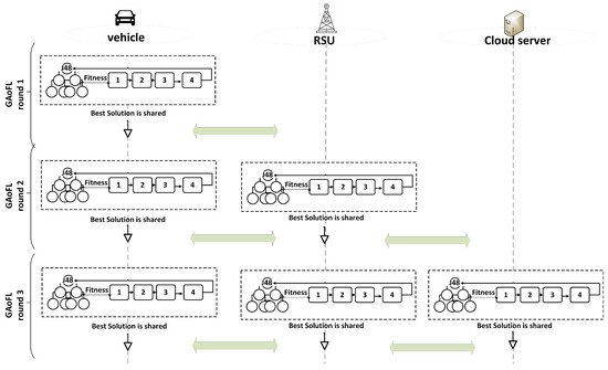 In the proposed algorithm, each device calculates the fitness value by computing the end-to-end delay (T) over data privacy (P) and Fmeasure values obtained from the candidate solution and learning rates. The calculation details are given in Section 2.2 and Section 2.3, respectively. In each learning round, devices find the best solution according to fitness value and share it with the other devices. In the next generation round, according to the best solution details, the RSU server is also included in the learning rounds. The same steps are repeated for all end-user devices and also for RSU servers, and the best solution is shared among them. According to the best solution detail, the cloud server can also be included in learning rounds, and, in that case, the same steps are repeated until the algorithm is converged according to fitness value. Here, including RSU and cloud servers in the training process is determined in accordance with the solution details produced by the genetic algorithm output. If the best solution determines the running tasks in the RSU and/or cloud servers, then in the next round, the RSU and/or cloud servers also run the genetic algorithm and share the best solution that they find.