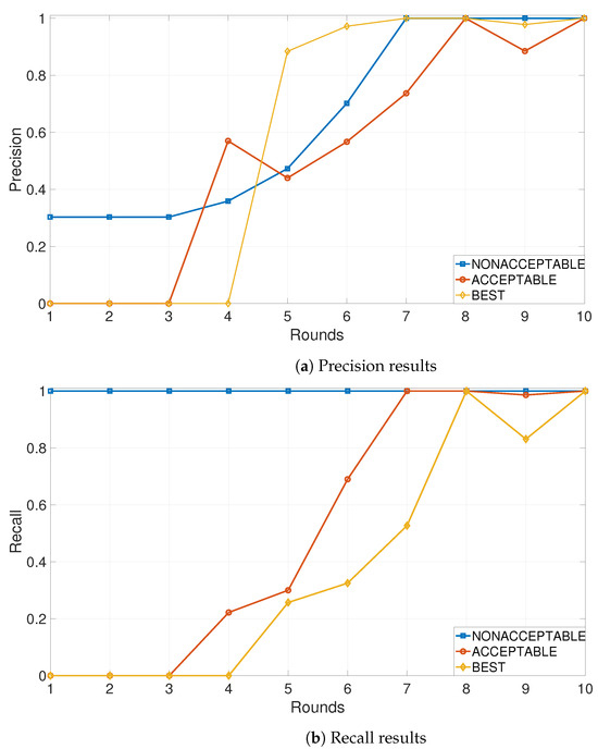 When N is 100, the number of solutions for trained data in each generation of the algorithm is given in Table 3. Here, in 10 rounds, the proposed algorithm converges in terms of fitness value (·). In the initial case, 16,807 solutions are obtained as nonacceptable according to the end-to-end delay (T) equation defined in Equation (1). In the second round, the proposed GAoFL approach in end-user devices results in better T values owing to the addition of a solution pool of 5 nonacceptable, 37 acceptable, and 1 best solutions. In the third round, vehicles and the RSUs also generate their solution pool, and the total solutions in the topology are achieved as 16,815 nonacceptable, 51 acceptable, and 4 best. The cloud server provides a solution pool after the 5th round of the proposed algorithm. In each round, the solutions of acceptable and best increase, but the nonacceptable solutions might decrease. This is caused by electing some solutions labeled as nonacceptable after the survival selection phase of the genetic algorithm. Though we are using Fmeasure as a performance metric throughout the study, we also want to observe the changes in the constituents of Fmeasure, i.e., precision and recall. In more precise terms, for a classification problem, there is a trade-off between precision and recall. An acceptable prediction performance in terms of precision–recall may vary depending on the problem or the class to be predicted. In our case, precision–recall both are roughly maximized, i.e., become 1, after roughly round 8, and the results are given in Figure 3.