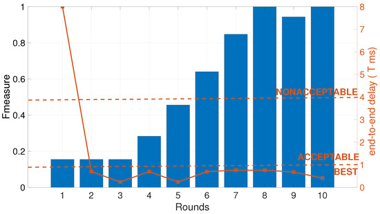 In Figure 4, Fmeasure and end-to-end delay (T) outcomes of the proposed algorithm for each round are given. In the left y-axis, Fmeasure is given by the bar graph, whereas in the right y-axis, end-to-end delay (T) is given by the line graph. According to the result, as the rounds increase, the Fmeasure for the average of each label (nonacceptable, acceptable, best) increases gradually. It reaches 1 when the algorithm is in the eighth round. There is a slight decrease in the ninth round, but the algorithm converges in the tenth round with the Fmeasure as 1. On the other hand, the proposed algorithm finds the best task training solutions from the second round to the tenth. Namely, except the initial round where the training is only performed on end-user devices with pure federated learning, the proposed algorithm can give best training scheduling in terms of end-to-end delay (T) to the topology. Moreover, the prediction performance in terms of Fmeasure reaches 1 under 10 rounds as the round increases.