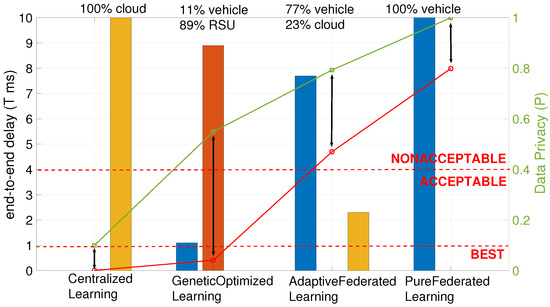 In Figure 5, the overall comparison of the proposed GAoFL approach and the conventional learning approaches, including centralized learning, adaptive federated learning, and pure federated learning, are given. These results were obtained when N is 100. The left y-axis shows the end-to-end delay (T) calculated by Equation (1), whereas the right y-axis shows the data privacy parameter (P) calculated by Equation (3). The red line plot shows the end-to-end delay, whereas the green line plot shows the data privacy parameter according to four different learning approaches. The bar graph represents the training task details for each of the learning approach results. In centralized learning, there is the deep learning approach, which aggregates data from the whole topology without considering the data privacy parameter and the training model in the centralized cloud server. Therefore, it is the best solution ever to minimize end-to-end delay (T); however, it suffers from data privacy since P is around 0.1, a relatively low value. In the proposed GAoFL approach, the predicted solution results in end-to-end delay under the BEST label. It trains 11%, 89%, and 0% of the tasks in vehicles, RSUs, and cloud servers, respectively. Owing to considering both delay and data privacy, the P value reaches nearly 0.55, which is quite higher than the one obtained in the centralized learning approach. The other federated learning approaches suffer in terms of end-to-end delay performance. They cannot predict the best solution. They can advise only nonacceptable solutions. Therefore, providing a data privacy parameter around 0.8 and 1 does not make sense against the end-to-end delay damages. Here, adaptive learning proposes to train 77% and 23% of the tasks in end-user devices and the cloud server, respectively. In the pure federated learning, only end-user devices are used for the task training, which results in the worst end-to-end delay performance.