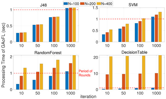 In Figure 6, different machine learning algorithms used in the proposed GAoFL approach are analyzed in terms of the processing time of GAoFL. The number of tasks (N) is increased from 100 to 400; namely, the total data task size to train the model is increased from 16,000 to 67,000 when there are 100 vehicles in the topology. The processing time should be under 1 s. If it exceeds 1 s, this means that the system capacity is full, and a capacity increase is required on the servers. In each round, vehicles, RSUs, and cloud servers should terminate the training process within 1 s. Therefore, each iteration per device should be finished under this determined time interval of the rounds. We compared J48, SVM, random forest, and decision table [44,45,46,47,48] in terms of processing time with different iteration numbers of the genetic algorithm where there are 100 chromosomes in the solution pool. In the figure, y-axes show the processing time, whereas x-axes show the increased iteration number of genetic algorithm in each round. The bar labels show the different task training sizes in the topology. Different machine learning algorithms result in the same Fmeasure for different training tasks. All machine learning algorithms can give a response under 1 s when the iteration number of the genetic algorithm is 10 and the number of vehicles is 100. However, as the number of tasks increases, random forest and decision table cannot satisfy the response time requirements. On the other hand, in order to enhance genetic algorithm performance to find the optimal solution that minimizes end-to-end delay by preserving data privacy, the iteration number should be 1000. Therefore, only J48 is capable of responding under the timing requirements in each round. As a result, J48 and SVM are usable when the number of tasks and iteration number are low, whereas J48 is the only choice in the proposed GAoFL approach when the number of tasks and iteration number are high.
