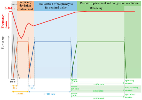 Three main frequency regulation reserves are defined at the European level, namely, the primary, secondary, and tertiary reserves [11]. Thanks to such reserves, TSOs are able to perform frequency regulation actions. Figure 3 shows the technical characteristics of the three frequency regulation reserves planned for the Italian network, in accordance with the Italian grid code. From Figure 3, it is possible to note the relevant activation time and the minimum required duration of such reserves. Their main purposes can be summarized as follows: