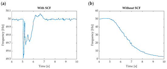 Frequency in the Sardinia network for single-phase fault in the 150 kV grid of central Sardinia. (a) All SCFSs and SCs are in normal operation; (b) SCFs are out of service [12].