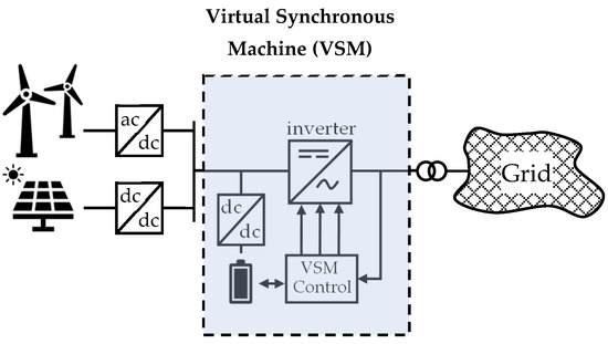 A Virtual Synchronous Machine (VSM) can be seen as a power converter, which, by means of proper control, can dynamically behave like a synchronous generator, as seen from the network point of connection. It can provide inertia and damping properties to the system [14] (Figure 6).