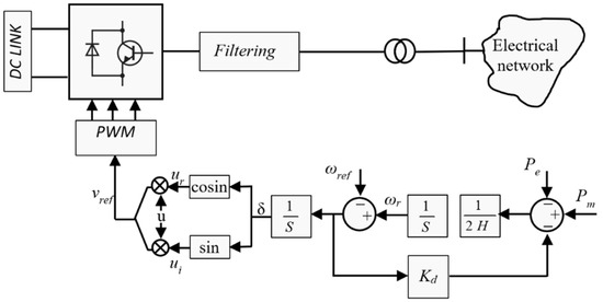 The implementation of Equation (7) in the VSM control makes the power converter behave like a synchronous generator connected to the network. Figure 8 represents a block diagram of the VSM control emulating the behavior of a synchronous machine according to Equation (7).
