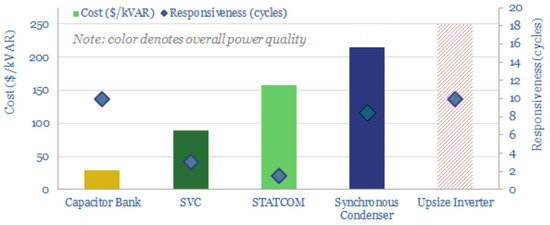 Concerning the overall costs for STATCOMs, in comparison with other technologies, Figure 22 provides an updated outlook [42]. As can be noticed, STATCOMs are more expensive than capacitor banks and SVCs, as expected, but they are more convenient than synchronous condensers. Typical cost ranges for STATCOMs are between 40 k€/Mvar and 150 k€/Mvar. These cost ranges are confirmed by recent STATCOM projects commissioned in Italy, Germany, and the UK; local situations may impact the final price.