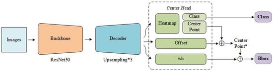 First, CenterNet introduces an object detection method based on a single central point. Traditional anchor-based detection methods require pre-defining a large number of potential bounding box sizes and ratios, which not only increases the computational burden but also adds to the model’s complexity. Meanwhile, other keypoint estimation-based object detection methods, such as CornerNet [36] and ExtremeNet [37], set two bounding box corners and the extremities (top, bottom, left, right, and center) of all objects as keypoints, respectively. This necessitates grouping and post-processing after detection. In contrast, CenterNet simplifies the process and reduces computational overhead by directly predicting the center points and dimensions (width and height) of objects, thereby enhancing efficiency.