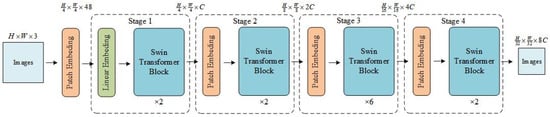 The architecture of Swin Transformer. It consists of four stages, each of which is a similar repetitive unit.
