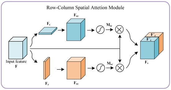 The Row-Column Spatial Attention Module (RCSAM) proposed herein is an innovative architecture designed to enhance specific features within rows and columns of a feature map. Figure 5 illustrates the structure of RCSAM, which encompasses an input feature map, attention generation, feature recalibration, and fusion operations. The process is detailed as follows: