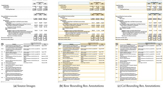 Some examples and the corresponding annotations in our collected dataset. The first col displays the table images, the second col shows the annotations for row-bounding boxes, and the third col displays the annotations for column-bounding boxes. In the second and third cols, each image is annotated in two different colors to represent different categories of objects.