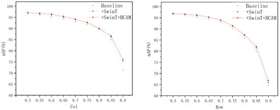 According to the data in Table 4 and Table 5, we observed that compared to the original baseline, replacing the backbone with a Swin Transformer significantly improved performance across detection thresholds from 0.5 to 0.9. At a threshold of 0.9, the mAP for column detection tasks increased from 71.30% to 75.42%, and for row detection tasks from 64.60% to 65.95%. After introducing the RCAM, the mAP further increased, reaching 76.07% for column detection and 66.82% for row detection at the threshold of 0.9. These findings confirm that the window-based self-attention and hierarchical structure in the Swin Transformer enhance the model’s ability to extract global features. Additionally, the RCAM introduced at each level, with its row-column spatial attention mechanisms, allows the model to automatically select more critical feature areas, further reducing the interference of irrelevant information.