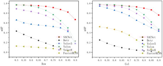 Based on the data in Table 7 and Table 8, we can conclude that our proposed model demonstrates more consistent performance in row-column detection tasks compared to the other models. When the threshold is set to 0.75, our model maintains an mAP value of over 90%. In column detection, it outperforms YOLOv5-s by 27.43%, YOLOv8-s by 13.56%, YOLOx-s by 5.55%, DETR by 88.42%, and Faster RCNN by 67.64%. In row detection, it surpasses these five models by 38.97%, 23.95%, 14.45%, 78.42%, and 84.04%, respectively. Moreover, even at a stringent threshold of 0.9, our model still exhibits robust row-column detection performance. The mAP for column detection is 76.07%, exceeding the aforementioned models by 33.01%, 30.82%, 29.01%, 75.37%, and 75.18%. For row detection, the mAP is 66.82%, which is higher by 49.11%, 49.02%, 44.02%, 66.44%, and 66.42%, respectively. To more clearly demonstrate the improvements achieved by SACNet, we have illustrated the data from Table 7 and Table 8 using dot-line graphs, as shown in Figure 11.