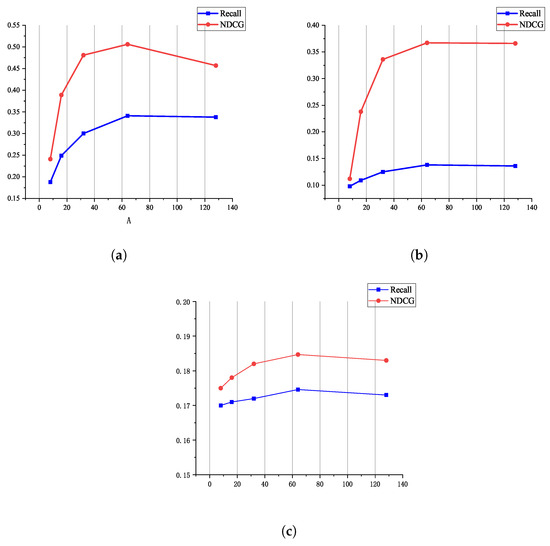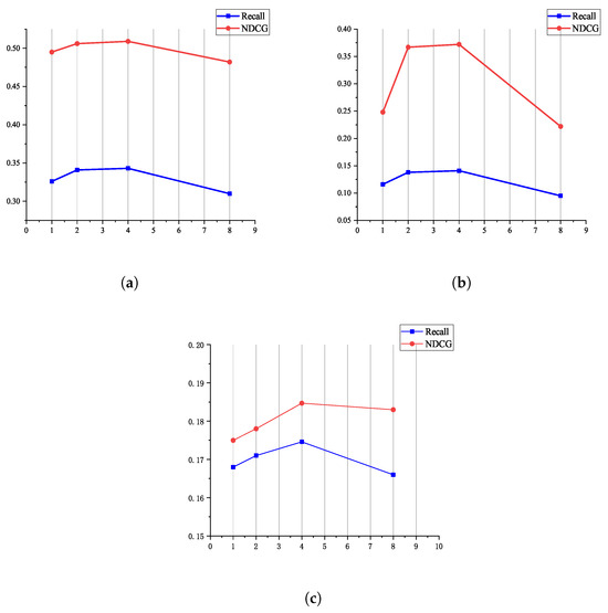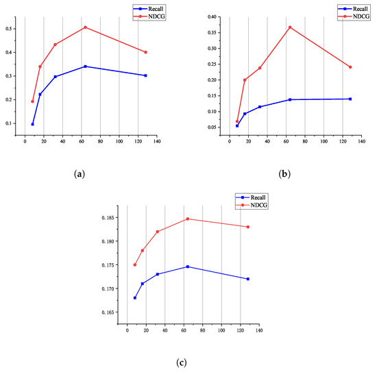 Through a comparative analysis of the impact of varying the embedding dimension d for the user and item IDs and the embedding dimension for attributes on the experimental results, it is evident that the interactive features between attributes, as well as user–item interaction features, are both effective in enhancing the recommendation performance. Furthermore, the magnitude of the change in Recall and NDCG for the ID embedding dimension d across the range of 8 to 128 is lower than that observed for the attribute embedding dimension within the same range, indicating that attribute interactions play a role in alleviating the sparsity issue inherent in user–item interaction behavior features.