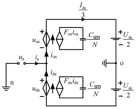 In Equation (4), Fua and Fda represent the average functions for the two arms; iua and ida represent the two arms’ currents; Idc represents the DC-side current; Ia represents the current amplitude of the A -side; ω represents the angular frequency of the AC-side voltage of the MMC; θa represents the phase angle; I2a represents the amplitude of the second-order circulating current; and θ2a represents the phase angle of the second-order circulating current in phase A.
