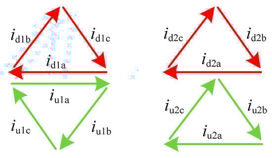 The characteristics of sub-module fluctuating currents are illustrated in Figure 3. For three sub-modules positioned at the same level in each phase, the AC components of the same frequency in their fluctuating currents have a phase difference of 120°. In three-phase fluctuating currents, the odd-order components, dominated by the fundamental frequency, are distributed in a positive sequence across the three phases. Within the same phase, the fluctuating currents of the upper and lower arms have the same amplitude but opposite phases. The even-order components, dominated by the second-order frequency, are distributed in a negative sequence across the three phases, with the fluctuating currents of the two arms in one phase having the same amplitude and phase.