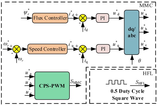The control method of the LC-MMC is depicted in Figure 5. The control method on the MMC side is the same as described in Section 2.2, using a vector control strategy to achieve normal motor drive. The LC-MMC system is also compatible with simpler constant voltage-to-frequency (V/f) control. To enable the coupling of fluctuating currents among the three-phase SMs in the MMC, the three half-bridge circuits that form the HFL circuit are controlled using identical open-loop synchronous signals with a 0.5 duty cycle. Compared to the control scheme of traditional MMC motor drive systems, the LC-MMC system does not require additional SM DC bus fluctuation suppression strategies. This is because the simple open-loop control of the HFL circuit effectively reduces capacitor voltage fluctuations, thereby simplifying the MMC-side control.