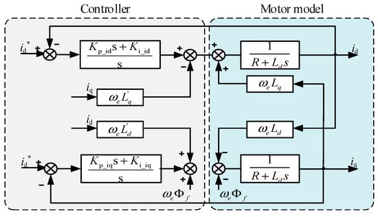 Because the research on the speed outer loop and current inner loop design for motor speed control system has been fairly mature, the intermediate steps in the control system regulator design are skipped in this section, and the description is mainly provided in the form of reference literature [23,24]. Taking the control method with id = 0 as an example, the detailed block of the inner loop in the dual closed-loop control of the MMC stage is depicted in Figure 6, and the simplified transfer function of the q-axis current can be obtained from [24]: