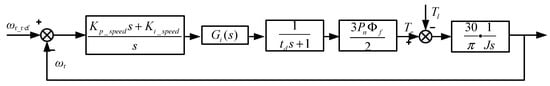 The speed outer loop is depicted in Figure 8, where the inner loop is equivalent to a typical first-order element. Here, Kp_speed and Ki_speed are the speed outer loop regulators; Gi(s) is the transfer function of the inner loop; td is the delay element; Pn is the number of motor pole pairs; ϕf is the size of the permanent magnet flux linkage; and J is the rotor moment of inertia.