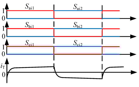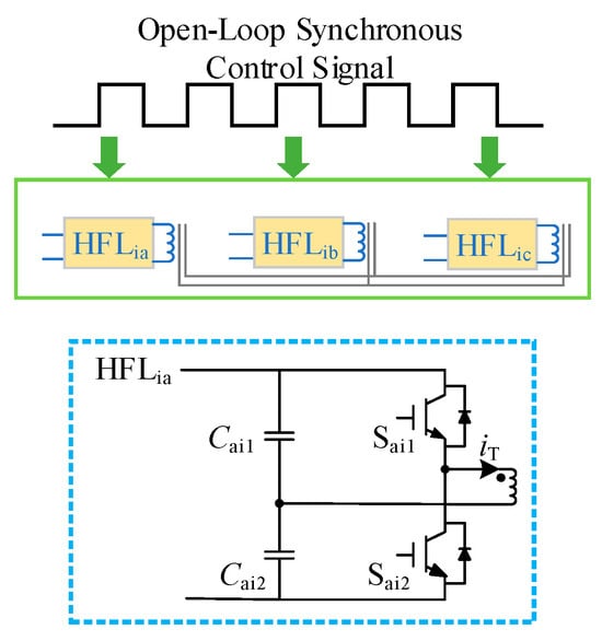 The schematic of the HFL circuit is depicted in Figure 10, and the switching sequence diagram is depicted in Figure 11. Taking HFLi as an example, where i denotes the i-th HFL module (i = 1, 2, 3, …, 2N), HFLix represents the sub-module of phase x (x = a, b, c) in HFLi. Since the HFL circuit uses a synchronous modulation signal with a 0.5 duty cycle, when Sai1 of HFLia is turned on, Sbi1 of HFLib and Sci1 of HFLic are also turned on, causing the transformer winding current iT to rise and remain positive, with the winding currents of the other two phases in the same direction as iT. When Sai2 of HFLia is turned on, Sbi2 of HFLib and Sci2 of HFLic are also turned on, causing the transformer winding current iT to fall and remain negative. The HFL circuit operates in this manner for each switching cycle.