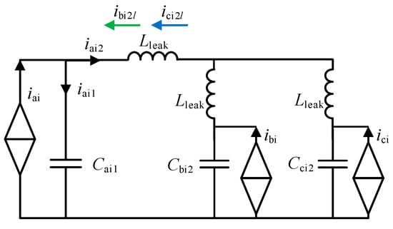 Considering the input currents of the phase B and C sub-modules, taking into account three-phase symmetry and utilizing the superposition theorem and parallel current-sharing principle, we can determine the currents entering phase A from phase B and C as ibi2l and ici2l.