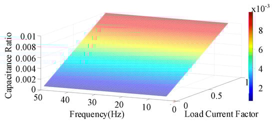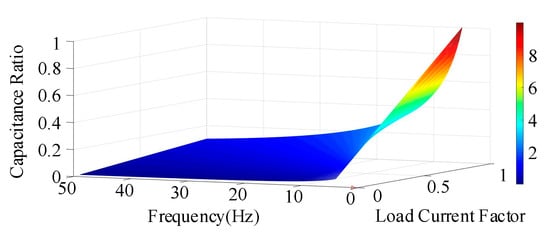 To demonstrate the weight reduction effect of capacitors in the LC-MMC motor drive system, we have plotted the correlation between the capacitance ratio of sub-module capacitors and both the frequency (f) and load current factor (F). This analysis is based on the minimum capacitance equations for a traditional MMC (Equation (2)) and LC-MMC (Equation (16)), as shown in Figure 13 and Figure 14. The vertical axis represents the ratio of the minimum capacitance under various operating conditions to the minimum capacitance of a fully-loaded, 5 Hz condition in a traditional MMC, with a range of 0 to 1. One horizontal axis is the frequency f, ranging from 5 to 50 Hz, and the other horizontal axis is the load current factor F, ranging from 0 to 1.