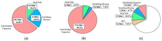 To demonstrate the power density advantage of the LC-MMC motor drive system brought by capacitor optimization, a volume comparison of the main components in a set of three-phase sub-modules between traditional MMC and LC-MMC motor drive systems is conducted based on the simulation conditions in Section 6. The comparison is divided into the following four aspects: