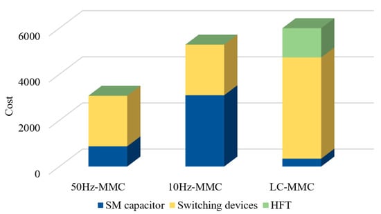 - With a 5% voltage ripple requirement at a rated frequency of 50 Hz, based on Equation (2) and considering a certain margin, the capacitance of the traditional MMC SM is 1.3 mF. Four B25680C1158K503 capacitors from TDK, rated at 1.5 kV and 1.5 mF, are selected and arranged in a series-parallel configuration to form the required sub-module capacitor. The total volume of the three-phase SM capacitors is 38.7 dm3, and the total cost is USD 876.6. At a low frequency of 10 Hz with a 5% voltage ripple requirement, the traditional MMC sub-module capacitance is 6.5 mF. Eighteen B25680C1158K503 capacitors from TDK, rated at 1.5 kV and 1.5 mF, are selected and arranged in a series-parallel configuration to form the required SM capacitor, resulting in a total volume of 174.2 dm3 and a total cost of USD 3094.2 for the three-phase sub-module capacitors. The capacitance of the LC-MMC SM is less affected by the operating frequency. With a 5% voltage ripple requirement across all frequencies, based on simulation results and considering a certain margin, the LC-MMC sub-module capacitance is 750 μF. Two B25680C1158K503 capacitors from TDK, rated at 1.5 kV and 1.5 mF, are selected and arranged in series to form the required sub-module capacitor, with a total volume of 19.4 dm3 and a total cost of USD 343.8. The volume of the LC-MMC sub-module capacitors is reduced to one-ninth of that of the traditional MMC.