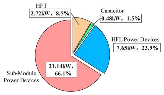 Based on the above description, the case for a loss calculation in this section is the following: the rated power is 1 MW; DC voltage is 8 kV; AC voltage is 4.16 kV; the number of SMs is four; and the switching frequency of the SMs is 2 kHz, and that of the HFL is 10 kHz. The total loss of the traditional MMC motor drive system is approximately 27.75 kW, with an efficiency of 97.3%. The loss distribution of the LC-MMC motor drive system is shown in Figure 17, with a total loss of about 31.99 kW and an efficiency of 96.9%. Compared to the traditional MMC motor drive system, the overall efficiency of the LC-MMC motor drive system is only slightly lower.