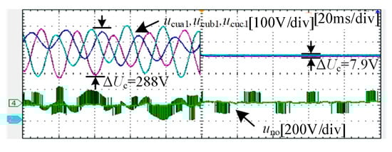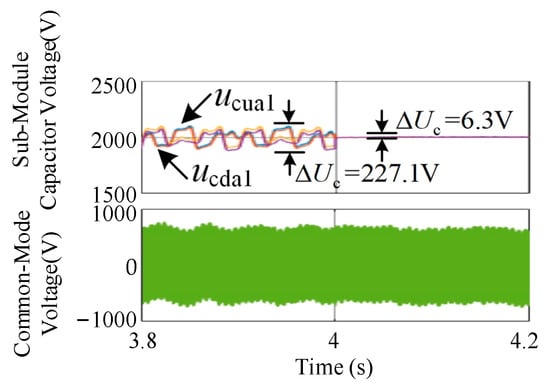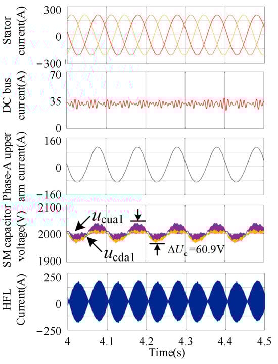 Calculations based on a 5% voltage ripple requirement over the full speed range of the motor drive system show that, under the same conditions, the SM capacitance value calculated from Equation (2) is much larger than the values listed in Table 1. This indicates that to reduce the SM capacitance, an SM voltage fluctuation suppression strategy must be employed.