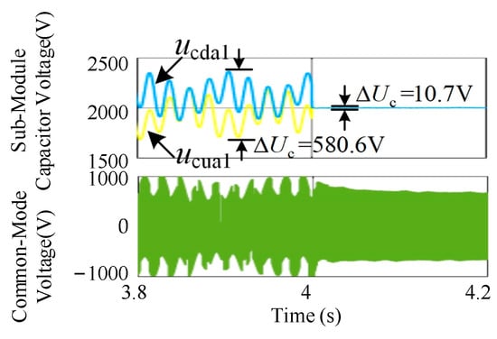 According to Equation (15), the proportion of current diverted into the capacitor differs due to the different frequencies. The HFL circuit shows better coupling and absorption effects for low-frequency fluctuating currents. Since the fluctuating current is primarily composed of low-frequency components, with Lleak in the microhenry (μH) range and C in the millifarad (mF) range, the SM capacitor receives a significantly reduced amount of fluctuating current compared to the HFL. As a result, the elimination of low-frequency ripple in the sub-module voltage is achieved. As shown in the study in [26], the arm circulating current is also eliminated.
