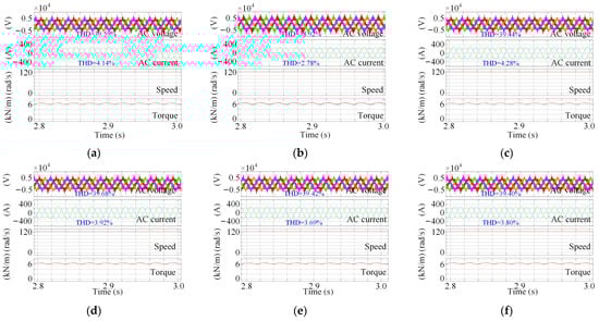 Based on the simulation parameters listed in Table 3, three-phase traditional MMC and LC-MMC motor drive system simulation models were built in the Matlab 2016B/Simulink environment. The proposed LC-MMC motor drive system was validated for both steady-state and dynamic performance.