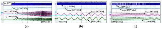 The dynamic performance test experiment waveforms of the LC-MMC are shown in Figure 25. Figure 25a shows the starting process from zero speed to rated speed. At zero speed starting, the SM voltage can still maintain stability without large fluctuations, proving that the proposed fluctuation power suppression strategy can be unaffected by the rotational speed. Figure 25b shows the dynamic experimental waveform of the torque increasing from 50% to 100%, and Figure 25c shows the dynamic experimental waveform of the speed decreasing from 50 Hz to 45 Hz. During the dynamic process, the LC-MMC can quickly achieve state transition and reach the new steady state. Figure 25 demonstrates that the proposed LC-MMC motor drive system exhibits good dynamic performance at low capacitance values.