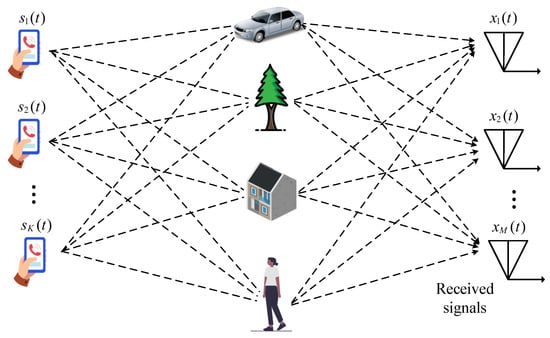 Consider a scenario with the scattering-rich environment, as illustrated in Figure 1, where a receiver with M antennas is employed to deal with the WSS problem. There are K far-field narrowband signals spreading over a wide frequency band. In addition, these signals are assumed to be wide-sense stationary and uncorrelated. The involved multi-band signal is modeled by
