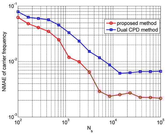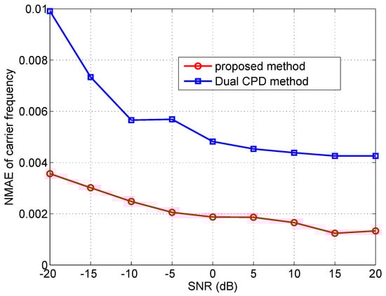 We employ the normalized mean absolute error (NMAE) to qualify the estimation accuracy of the carrier frequencies. The NMAE is defined as