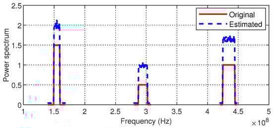 In addition, we show the original and reconstructed power spectra of one implementation when the SNR is 10dB and in Figure 6. It can be observed that the proposed method can accurately recover the power spectra of the considered wideband (despite there existing the scaling ambiguity) with a sampling rate significantly lower than . Although the CP decomposition and the unknown channel introduce amplitude deviation in the estimated power spectrum, the proposed method can still provide information about a vacant spectrum for secondary access.