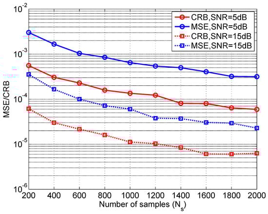 Figure 7 shows the MSE and CRB as a function of the number of the samples (i.e., ) when the SNRs are set to 5 dB and 15 dB. It can be observed that both the MSE and the CRB exhibit a similar decreasing trend, indicating that increasing the number of the samples benefits the estimation of the carrier frequency. However, it should be noted that the gap between the CRB and the MSE for the same is similar for the case both with dB and with dB. This result is consistent with the findings in Figure 4, suggesting that our method is not highly sensitive to SNRs within regions with a relatively large value (generally above 0 dB).