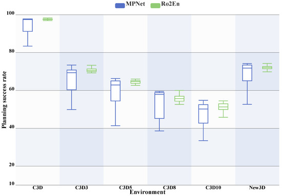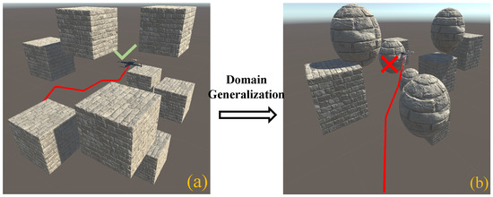 Recently, promoted by significant progress in artificial intelligence, intelligent robots have become a hot topic in the robotics community. For natural and smooth interaction with the environment, real-time MP is a critical feature of intelligent robots. For 2D scenarios, e.g., mobile robot navigation, many conventional approaches could solve the problem. However, they do not guarantee efficiency in 3D situations since their spatial search-based scheme exists in a much larger solution space caused by the extra third dimension. Fast and efficient MP algorithms are essential in 3D situations. Recently, Neural Network-based Motion Planning (NNMP) algorithms [9,10,11,12,13,14] have shown promising potential. Due to the fast inference and powerful feature learning ability of neural networks, these approaches, such as MPNet [9], GrMPN [15], and CoMPNetX [10], achieve surprising results. End-to-end NNMP especially, excellently balances planning speed and success rate. For instance, MPNet’s planning success rate surpasses 90%, while the calculation time is less than 1 s. However, these methods have similar limitations. As shown in Figure 1, when the working environment is unseen (right sub-figure), i.e., different from the training environments (seen case, left sub-figure), the success planning rate drops significantly. This situation indicates that data-driven neural models present generalization issues. In other words, they are not applicable to new scenarios. Unfortunately, the current related methods do not deal with such issues explicitly.