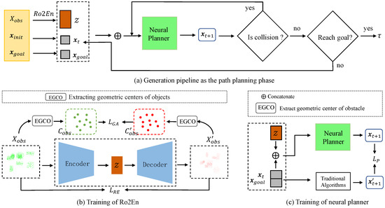 Motion planning process. As aforementioned, our method aims to achieve better environment coding while other steps for motion planning follow the previous works [10,15] totally. Specifically, during the model training phase, we first train the environment encoder by the proposed Ro2En method. After that, we train the neural planner. In the learning task, the input is concatenated by the environment encoding Z (generated by the trained environment encoder), the path state , and the goal , while the next path states (predicted by traditional algorithms) have the supervision label. Here, N is the path length. During the inference phase, the work pipeline is different a bit from the model training in terms of planner usage. Specifically, it predicts the path states one by one.