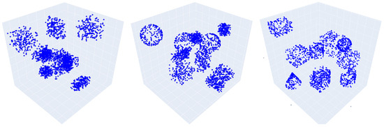 As there is no benchmark designed for domain generalization of fast motion planning, we build a dataset for this transfer task. For a fair comparison, the source domain is the same as with the MPNet setting, denoted by C3D. At the same time, four new datasets with different environments, i.e., C3D3, C3D5, C3D8, and C3D10,and New3D are built to be taken as the unseen target domains. Figure 4 illustrates two typical scenarios of these built datasets in point cloud form. Specifically, C3D has 30 k environments where the environments numbered 0 to 109 have 5000 × 110 feasible paths generated by RRT* [7]. In the model training phase, the 30 k environments are used for Ro2En training while we adopt the first 110 environments to train the neural planner. As for the target domain, each sub-domain has 100 environments, which differ from C3D in the type and location of the obstacles to some extent. For instance, as shown in Table 1, the C3D3 has 3 spheres and 7 cubes in each environment that never appear in C3D. In the New3D, the complex shapes include a cone combination consisting of a cone and a cylinder and a combination consisting of a cube and a sphere. The code for the target domain generation is available at https://github.com/tntek/Ro2En (accessed on 28 October 2024). Based on the given datasets, we build five domain generalization tasks: C3D→C3D3, C3D→C3D5, C3D→C3D8, C3D→C3D10 and C3D→New3D.