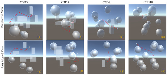 Visualization of a typical motion planning path. First row: (a–d) show the 3D perspective view results in the unseen cases C3D3, C3D5, C3D8, and C3D10, respectively. Second row: (e–h) present the corresponding results in 2D projection view: axis aligned orthogonal view.