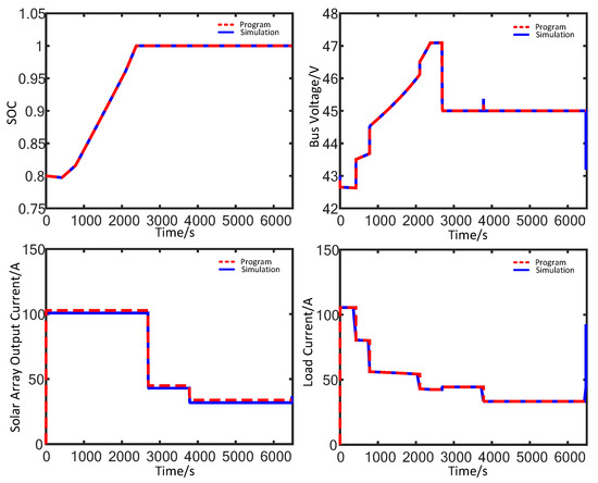 As shown in Figure 9, the computational results from the actual code closely match the MATLAB simulation results, achieving a fast solution for 20,000 data sets in under 5 s. Although the reduced-order simplified model is based on the full-order mathematical model of the spacecraft electrical system, it enables fast and efficient solving, making it suitable for energy balance evaluations and digital twin simulations. Additionally, the model can be extended to study the interaction between the power system and other subsystems, such as attitude and orbit control and satellite computers.