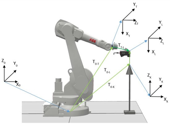 Reference systems related to the robot base, flange, 2D scanner, and calibration point were adopted (Figure 2):