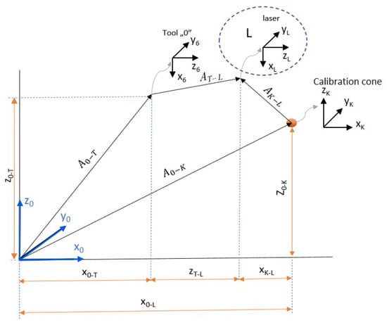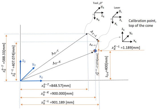 where is the identity matrix, and is the vector between the base frame and the calibration point. Matrix (3) describes the transformation of the coordinate system from the base of the robot to the top of the cone. In this transformation, rotation of the systems is not required, so it is assumed that the minor is a unit matrix. The matrix describing the position of the top of the cone relative to the measurement system is written:
