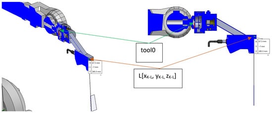 The determined coordinates L = [67.5, −7, 285.5] were assumed during the design of this tool. The differences compared to the method proposed in the article result from errors in both methods. In the CAD model-based method, the error arises from discrepancies between the CAD model and the actual component. For elements manufactured on a CNC machine, this error may be ±0.1 mm, but it can be reduced by measuring the components, for example, using a caliper with an accuracy of 0.01 mm (these are easy-to-measure elements like cylinders). The differences also stem from errors in the alignment of the tool components. In the case under consideration, the use of positioning pins resulted in an error of about 0.02 mm per alignment. Other elements introducing uncertainty are the CAD models of the Schunk changer and the Keyence scanner, whose accuracy was verified using a caliper. In summary, the error of the method based on CAD models is approximately 0.16 mm.