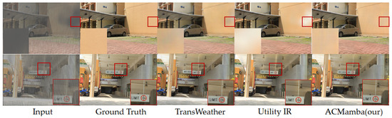 - Valanarasu, J.M.J.; Yasarla, R.; Patel, V.M. TransWeather: Transformer-based restoration of images degraded by adverse weather conditions. In Proceedings of the IEEE Conference on Computer Vision and Pattern Recognition, New Orleans, LA, USA, 18–24 June 2022; pp. 2353–2363. [Google Scholar]